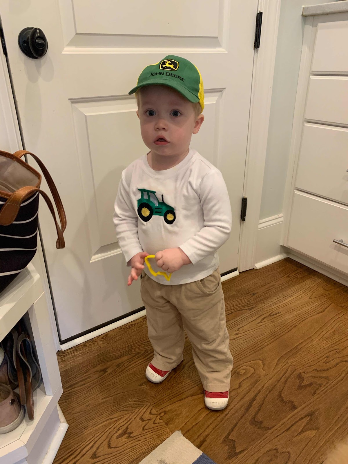 Here is he ready to roll in his John Deere hat and a shirt that Christine made for him!