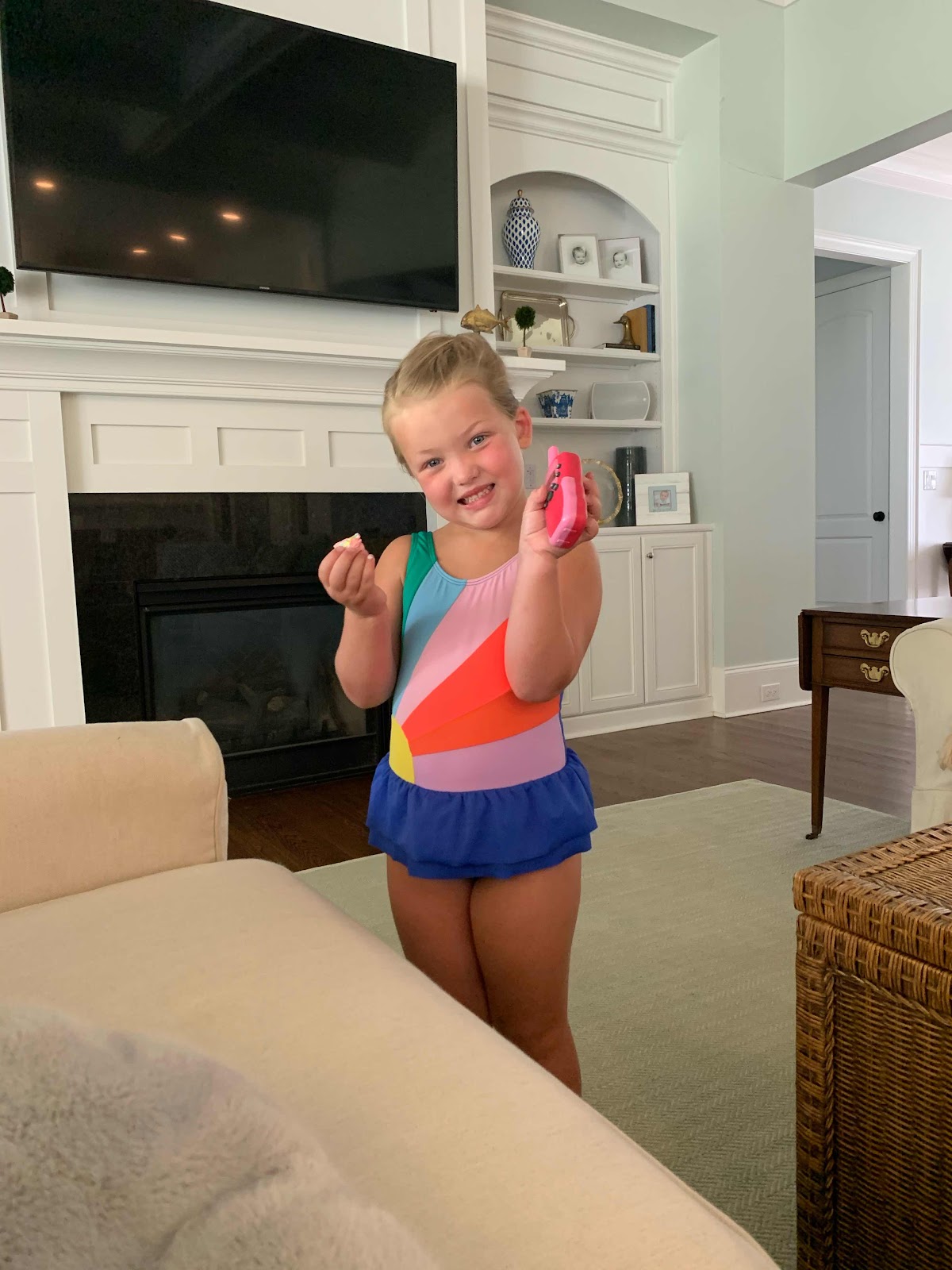 Ready for the pool! Her suit is from Mini Boden but they don't have it anymore! I love their suits for her though. Very well made and hold their color!