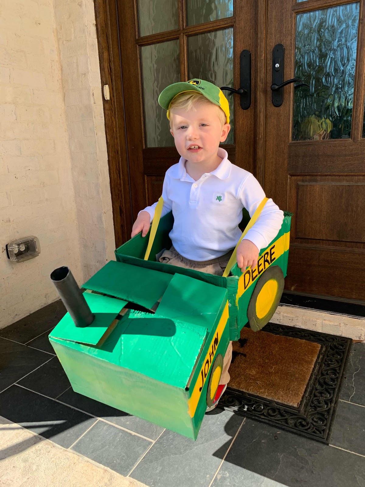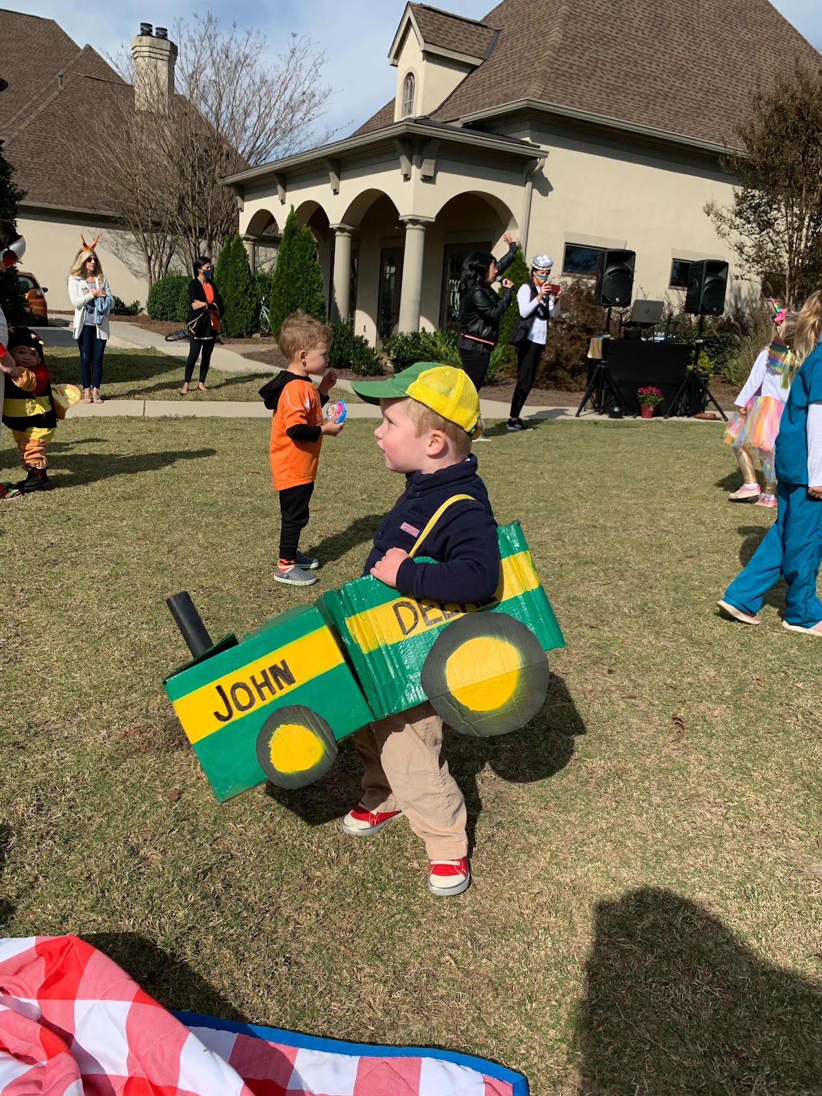 My friend Jen’s husband said Grady won the costume contest. I think his name just happened to be first in the list! ;) Can yall believe that this terribly uncrafty person made his costume?! When I asked him about a month ago what he wanted to be, he said TRAC-TA! So duh, that’s what we did! I did a google search and some cute homemade tractor costumes popped up so those were my inspiration!  Couple amazon boxes, some spray paint and ribbon and it happened!