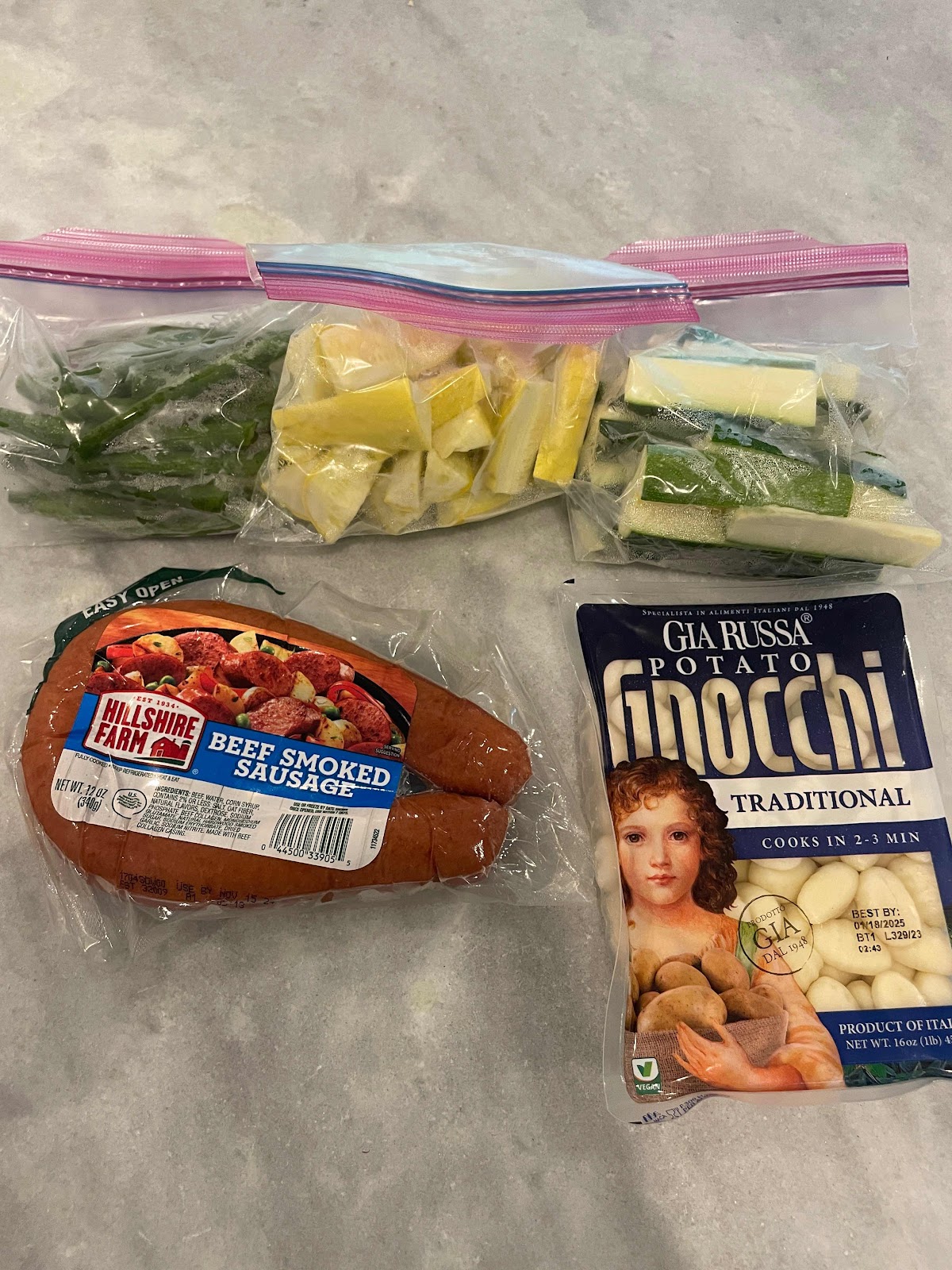 Kind of just threw this together last night. I've actually never made gnocchi ever. But I saw a recipe last week on Instagram and I was like I should buy some and see if we like it. You can see all of my cut veggies - green beans, squash and zucchini. I clean and cut all of the things every Sunday so dinner after work is very easy.
