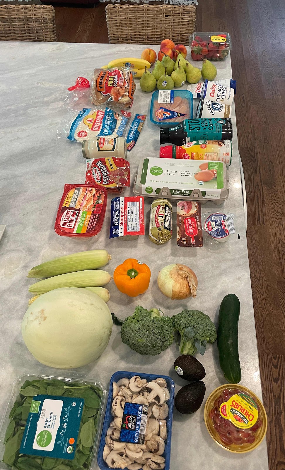 Fruits and veggies. I like having a ton of this stuff because it always gets eaten. I use a lot of this in my egg scramble some mornings. The kids will eat cucumber or peppers with their lunch. I will use the corn for dinner one night and could always steam spinach or broccoli for us too. I always rinse and cut most of these when I get home from the store so they're prepped and ready to roll.