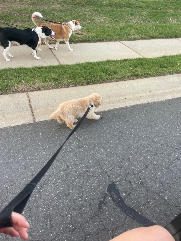 Skiff walked about one house length. He is not allowed to walk long distances until 18 months old to let his bones develop. Walking with Daisy and Lindy!