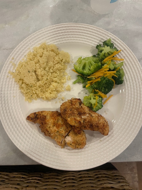 3. Italian Parmesan Chicken Tenders - soak in salt water for 20 min. Rinse. Dip each one in raw egg then Italian breadcrumbs. Air fry for 13 min at 400 degrees. (The salt water makes them never dry out - try it. My friend Hilary has changed cooking chicken for me by telling me this trick!)